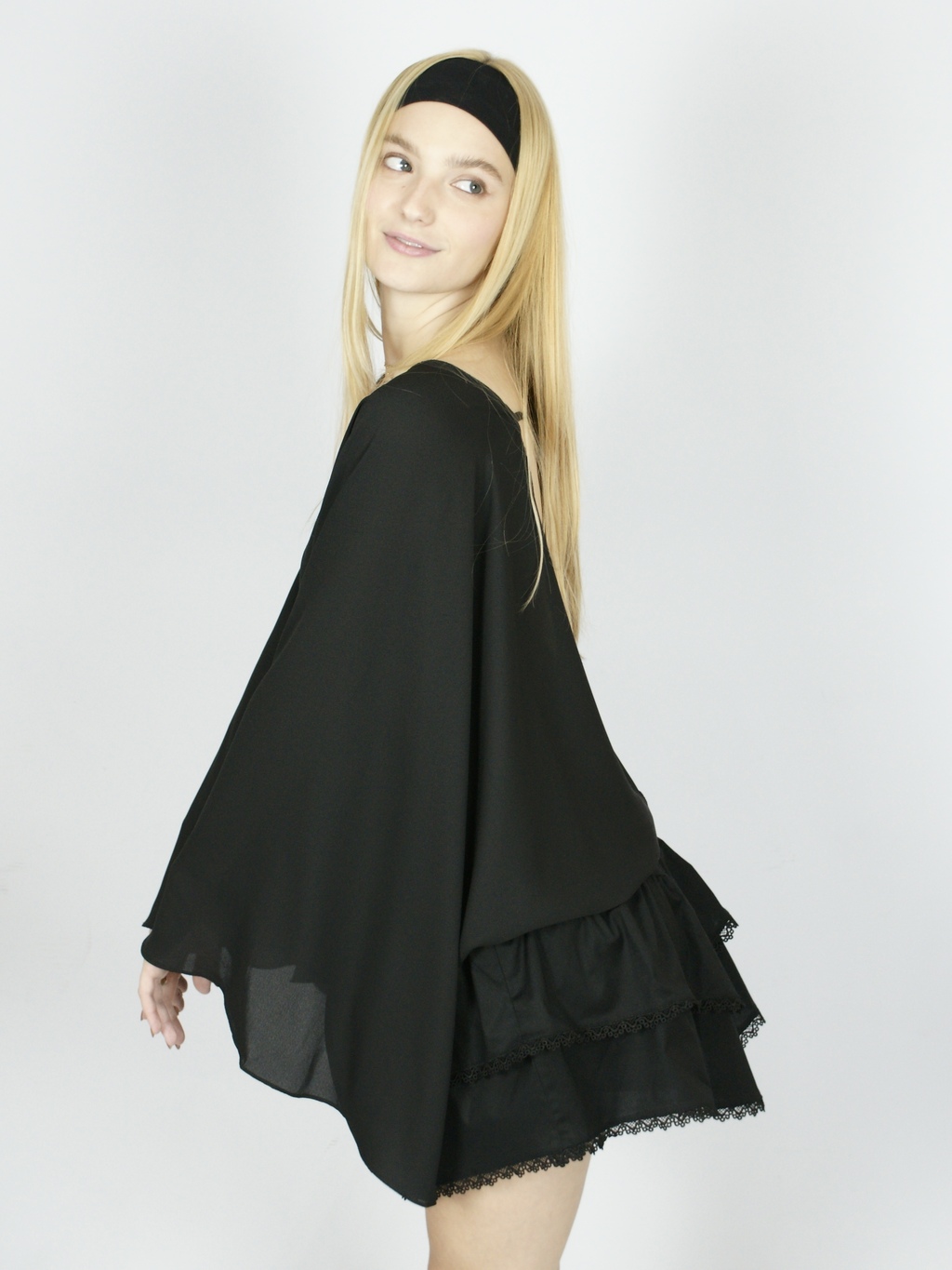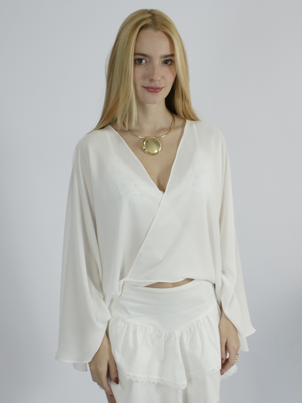 Blusa estilo envelope com transpasse na parte da frente e das costas, criando sobreposição dos tecidos dos dois lados. O modelo tem caimento solto no corpo e barra finalizada com acabamento em lenço, que traz um toque mais delicado à peça. Nas costas, conta com dois roletês — um de cada lado — com ponteiras metálicas douradas, que permitem regular a abertura do decote com amarração ou laço. As mangas são longas, amplas e com caimento leve. O tecido tem transparência proposital — ideal para usar com top de renda ou lingerie aparente por baixo